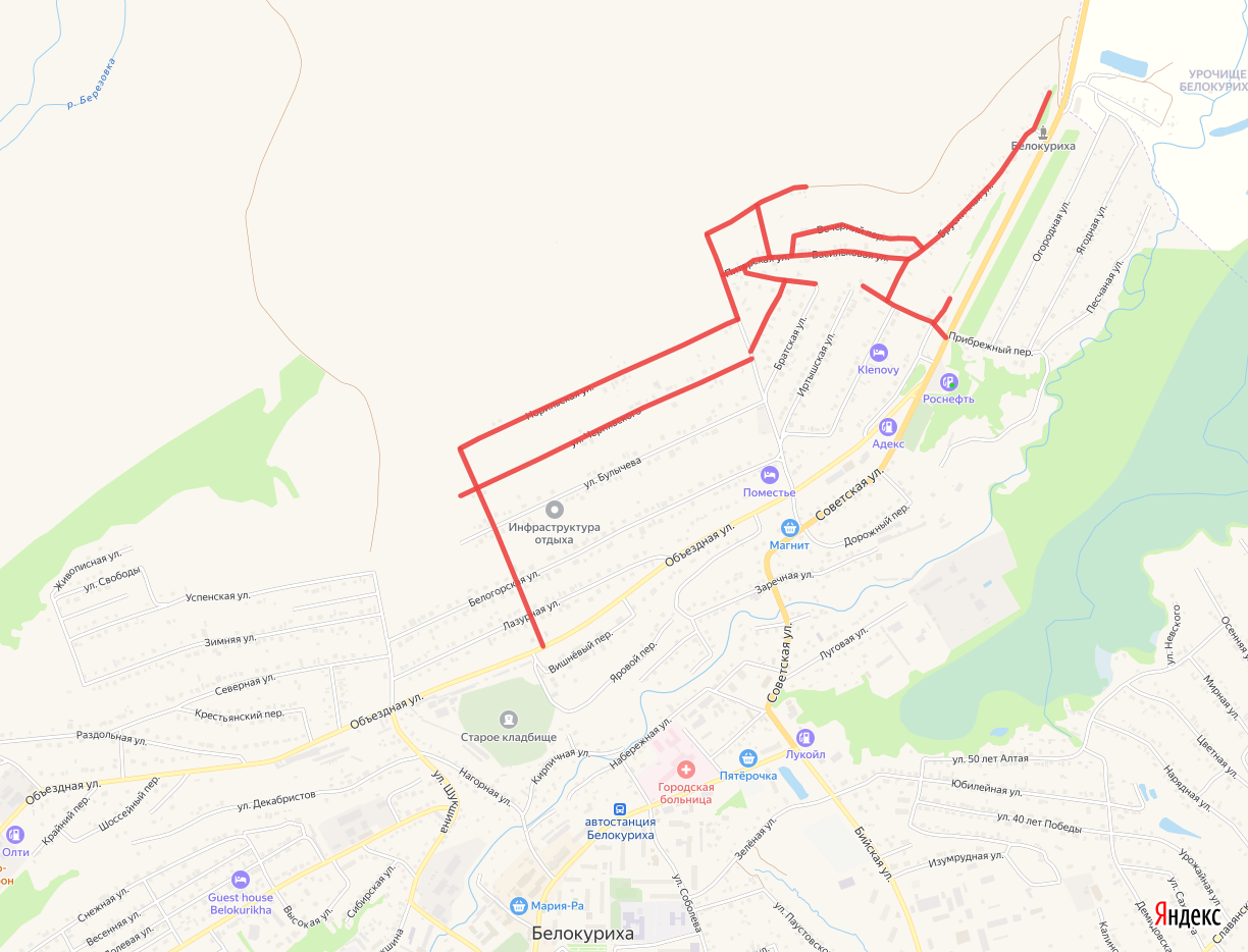 По улицам: ул Брусничная, Васильковая, Питерская, Отдельная, Новосибирская, Барнаульская, Иркутская, Норильская, Чернявского, пер. Вечерний и пер.Телецкий )
